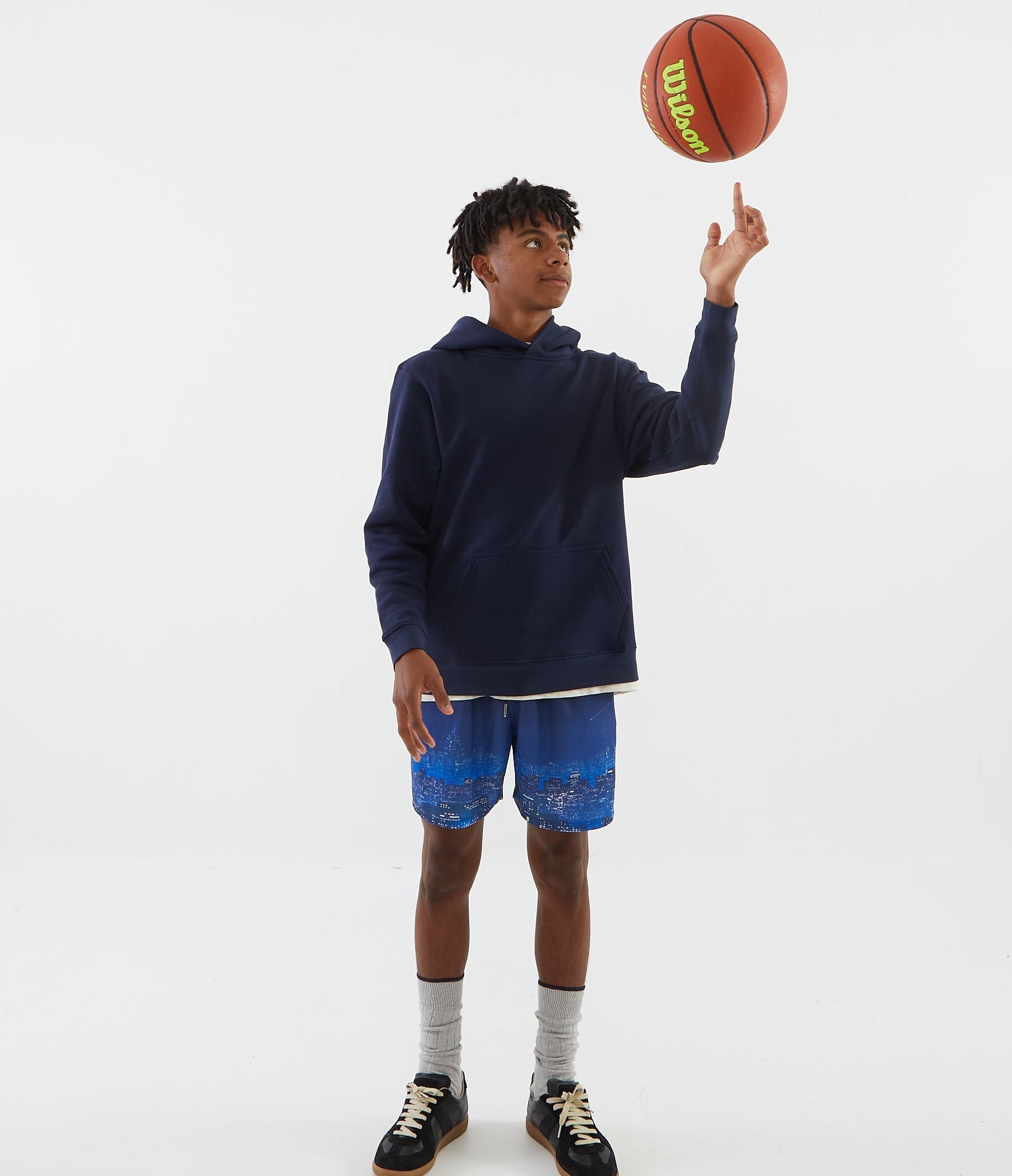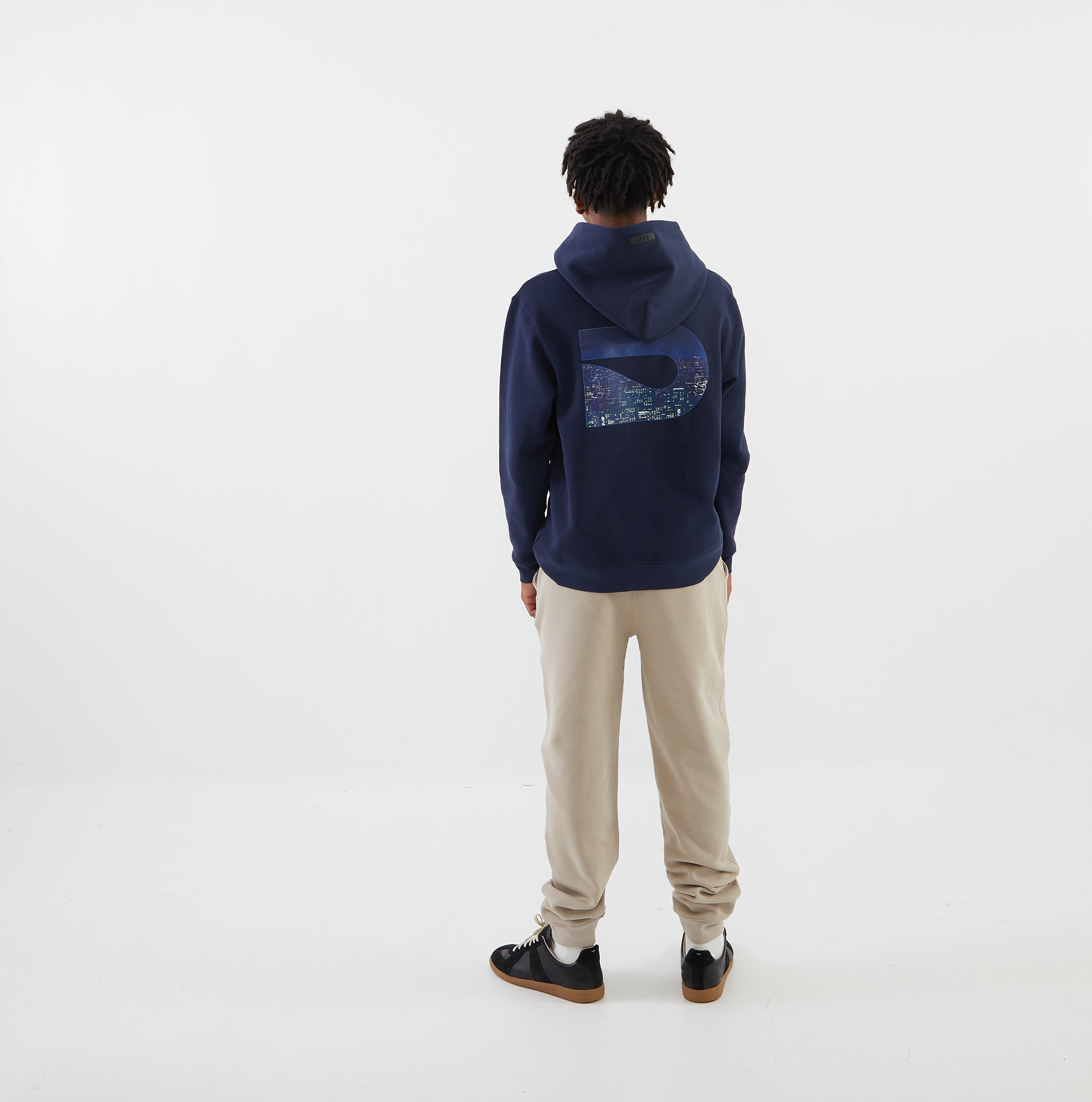 Mid-weight navy fleece with City Lights Drip graphic on back