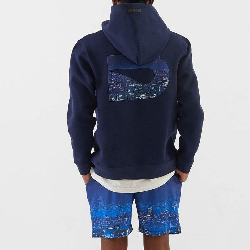 Custom navy shorts with skyline design